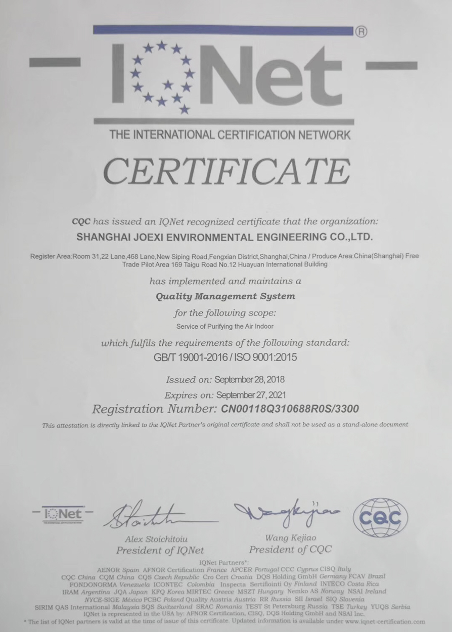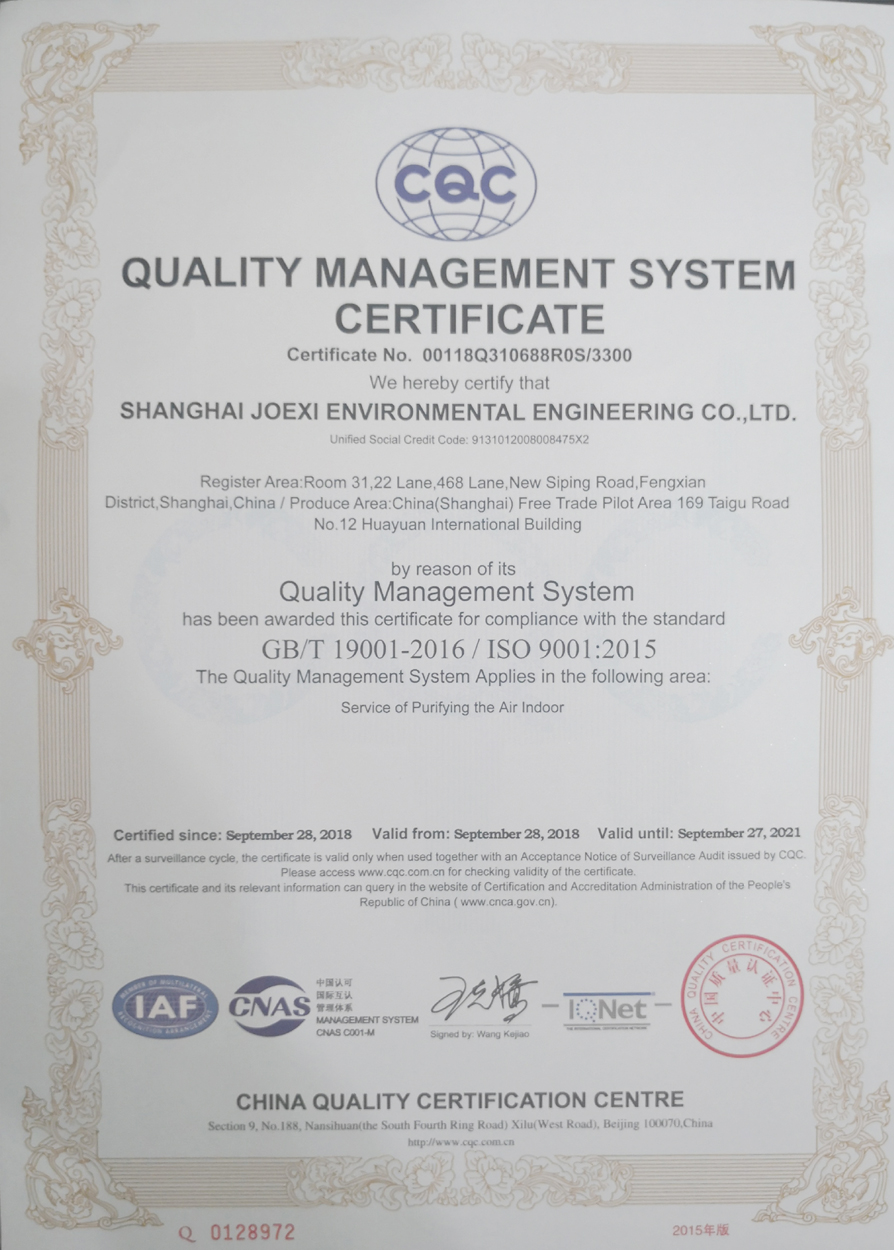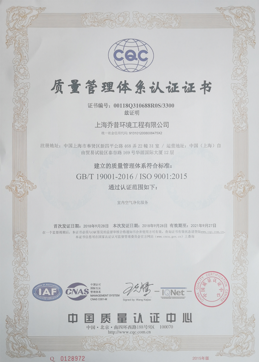 2018年10月15日 乔昔环境收到一份沉甸甸的认证证书,经过为期三个月的准备乔昔环境顺利通过 中国质量认证中心(CQC) 颁发的《ISO9001国际体系认证》,本次认证由中国检测集团全程权威监督,从产品生产、公司服务体系、公司采购系统、公司管理制度、内部培训系统、售后服务体系、风险管理体系、公司战略布局、可追溯系统等对公司进行了全方位的审查,放眼业界能够通过此体系认证的企业也是凤毛麟角,这也将奠定了乔昔环境走向国际标准室内空气质量的重要基础,我们将继续努力争做业界的风向标,用良心作为企业的底限,用匠心为改善人居健康环境而奋斗!